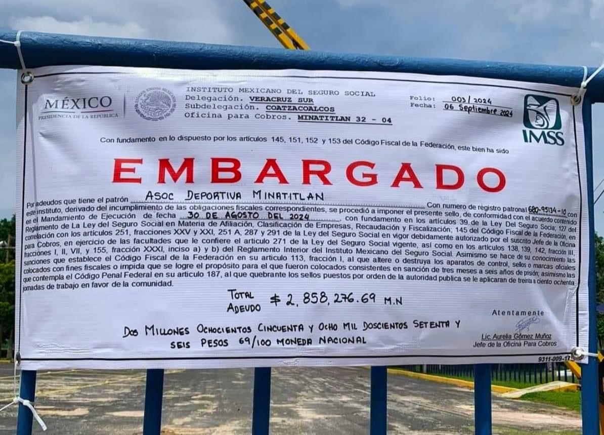Minatitlán, Ver., 7 de septiembre del 2024 (Héber Azamar).- La histórica Asociación Deportiva Minatitlán (ADM), una de las instituciones más emblemáticas del país, ha sido embargada debido a una deuda de casi tres millones de pesos con el Instituto Mexicano del Seguro Social (IMSS). La noticia ha causado sorpresa e indignación entre los socios y la ciudadanía.